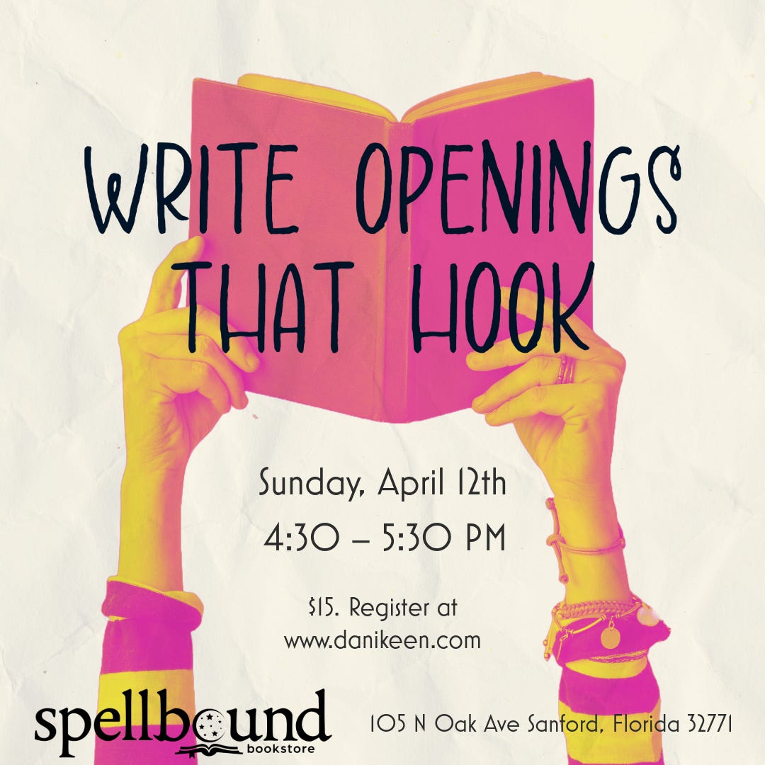 This is why I’m teaching a mini master class on Openings That Hook. These questions are big. Questions that ebb and flow throughout the course of drafting. And they start on the first page. When that reader picks up your novel at a bookstore, and thumbs to the first page, they are deciding within a few hundred words if they will keep reading.